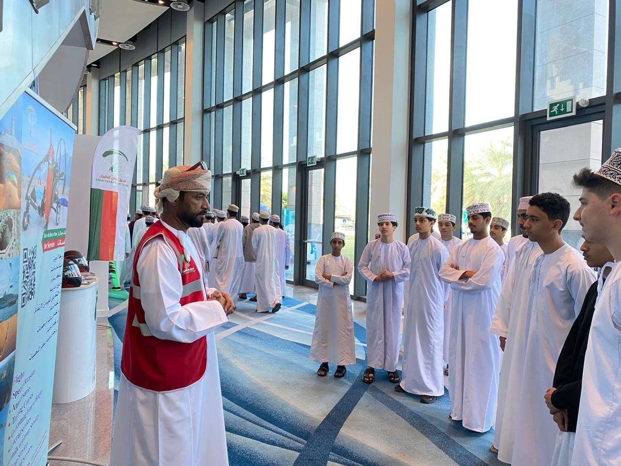 Captain Khalil Al Jabri, leader of the Oman Aviation Team, provided an engaging explanation of various types of paragliders and performed a series of aerial displays. The tour also covered private jet charter services, such as “Jetec,” where students learned about booking features and “door-to-plane” transport. Additionally, they explored the latest drone applications in cargo, passenger, and food delivery.